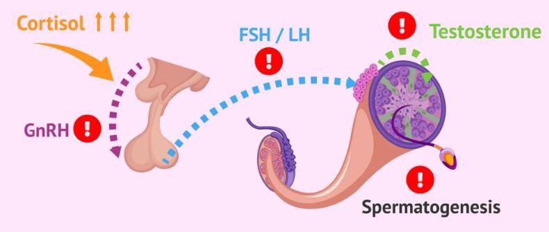 In a healthy state, testosterone secretion in the testis is controlled by FSH and LH. The hormone known as testosterone is the one that ultimately steps in and encourages spermatogenesis, or the production of spermatozoa. The concentrations of hormones controlled by the brain change when elevated cortisol levels are present in the blood as a result of ongoing worry. This alters testosterone production, FSH and LH levels, and sperm production. Further changes in cortisol levels have a deleterious impact on sperm parameters, causing a reduction in sperm concentration, motility, and morphology as a result of altered spermatogenesis6.
